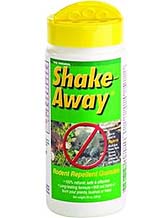 Shake-Away for Rodents is made from a combination blend of dried Bobcat and Fox urine into a powder formula. Patented 100% organic method to keep mice, rats, moles, voles, and shrews at bay. To protect against burrowing animals, sprinkle Shake-Away powder directly into every hole you find in your yard. gardens, etc. To protect against moles, sprinkle Shake Away in every hole you find in your yard and take a small stick or similar object and poke holes 2" deep every four feet along all tunnels. Sprinkle each hole with Shake Away, then cover with dirt. Shake Away is 100% natural and is safe for use around humans, animals, pets, plants, bushes, trees, and the environment.